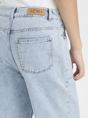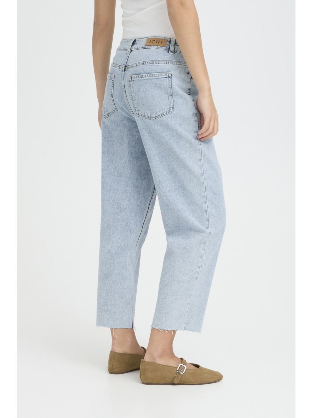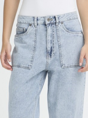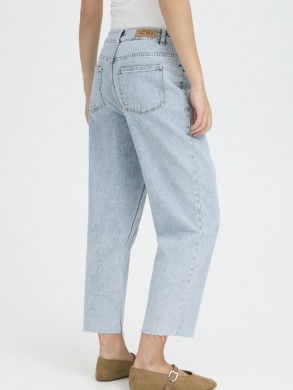 Jean denim bleu clair délavé, taille normal, bas effiloché