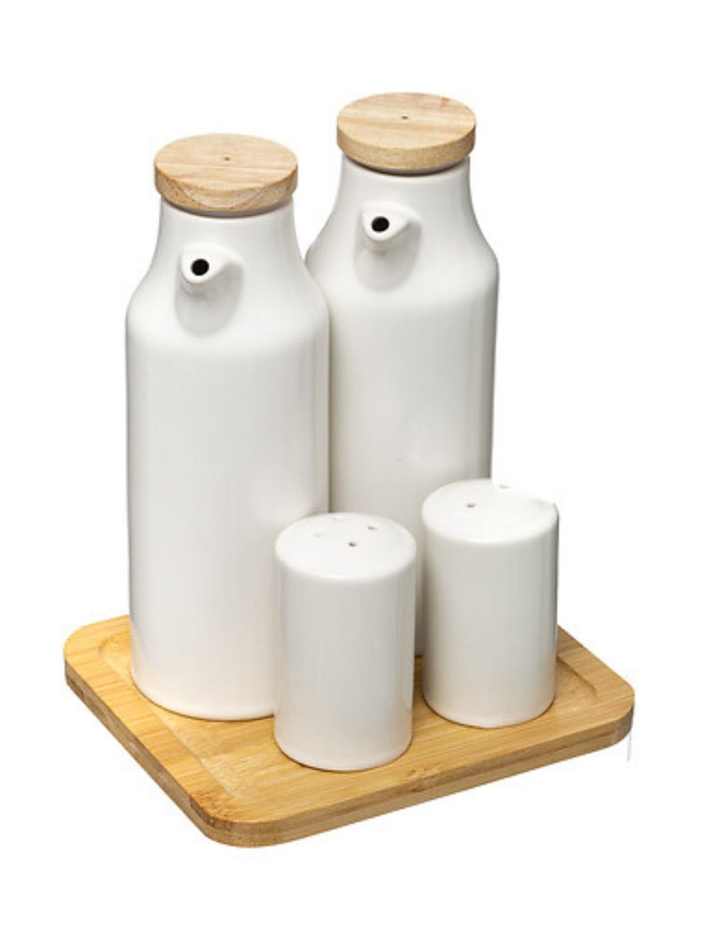 Service huile vinaigre sel poivre en céramique blanche avec un plateau en bambou