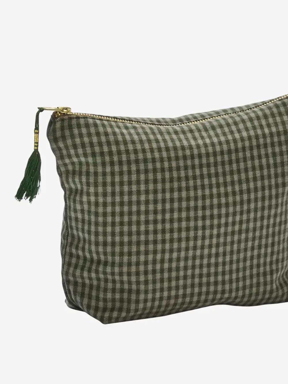Trousse de toilette en coton à carreaux en vert foncé et vert laurier, ornée d'un pompon fait main.