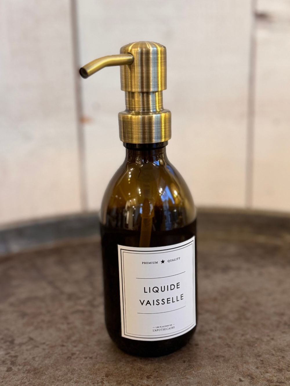 Un flacon transparent en verre de 250 ml avec sa pompe en laiton inclus, à remplir avec votre liquide vaisselle.