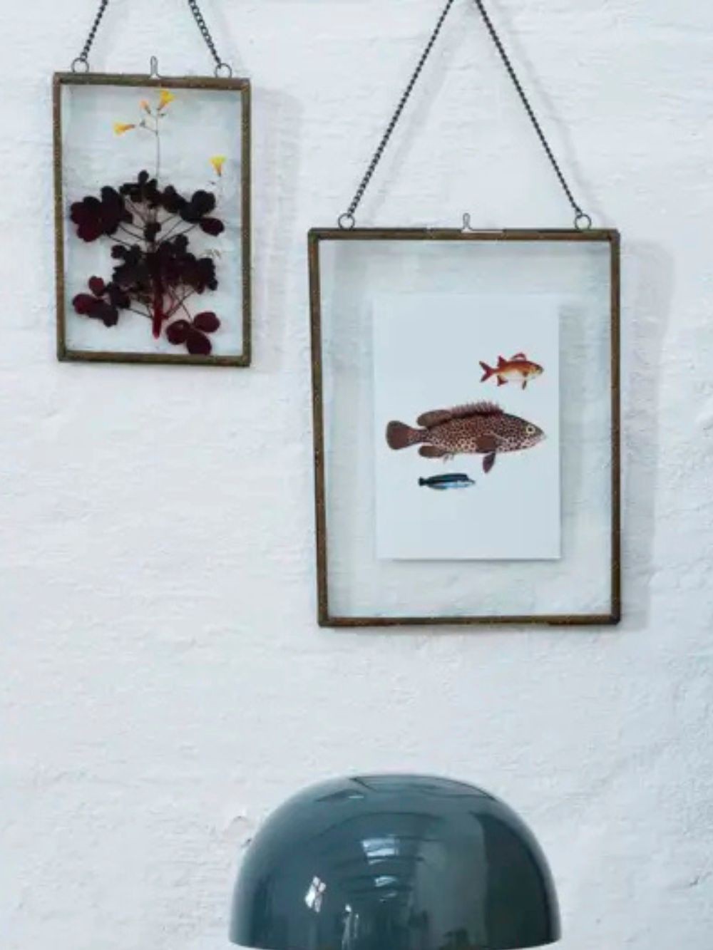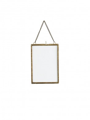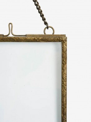 Cadre photo suspendu associe verre transparent et fer à une élégante finition en laiton vieilli d'Inde et à de délicates impressions florales.