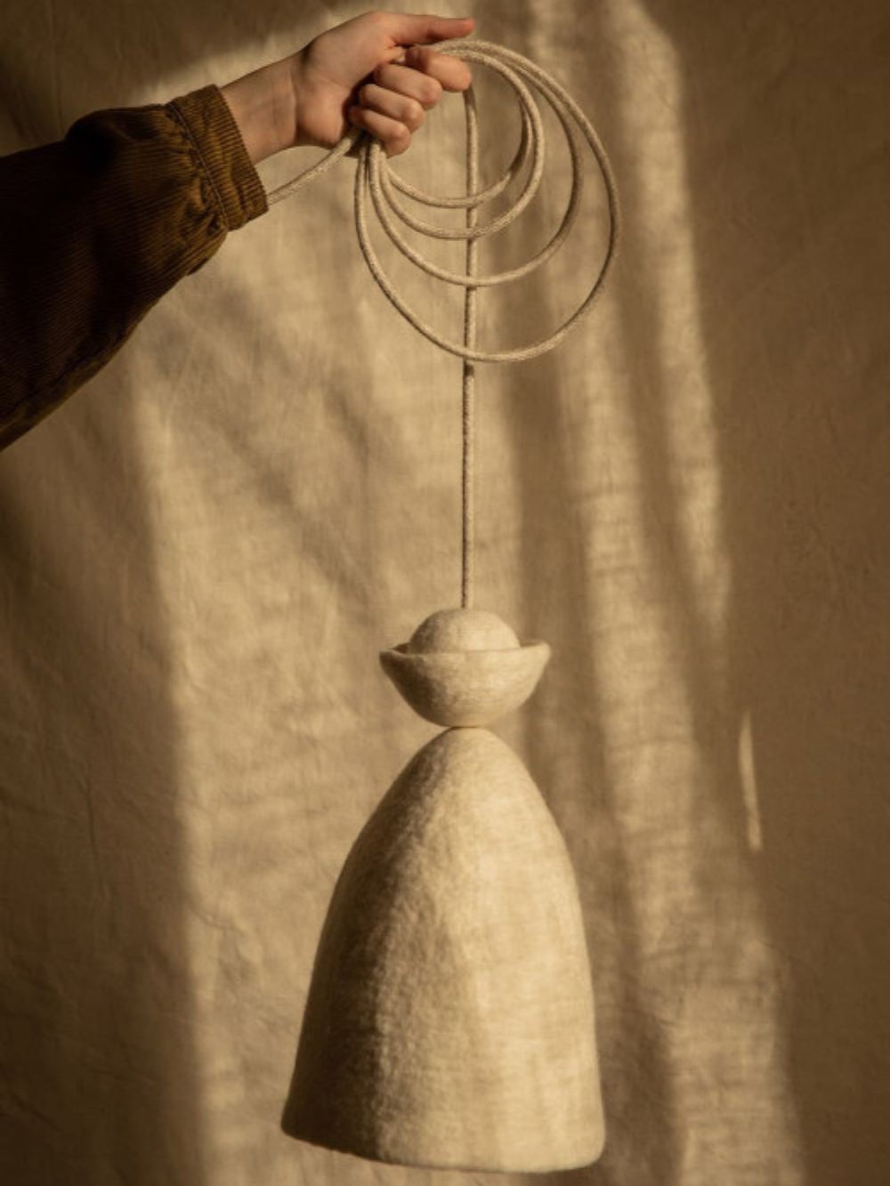 Suspension en feutre naturel, avec son design graphique. Fabriquée à la main au Népal.