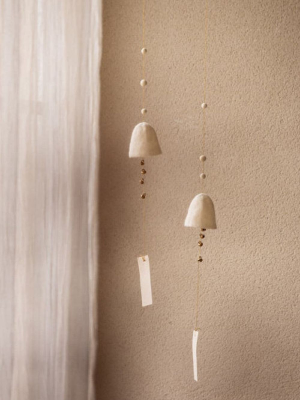 Cloches en feutre avec des grelots en laiton et du papier népalais.