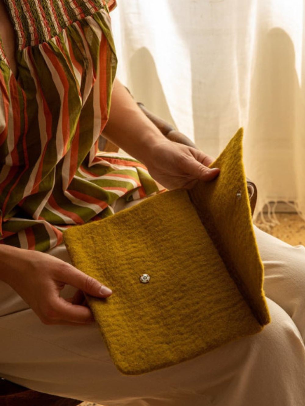 Porte-documents A5 est idéale pour ranger ou transporter vos documents en toute occasion. Douce et organique, façonnée en une seule pièce par les mains expertes de nos artisanes au Népal, elle deviendra l'écrin favori de vos documents et autres papiers. Très pratique au quotidien, elle se ferme à l'aide d'un bouton-pression invisible.
