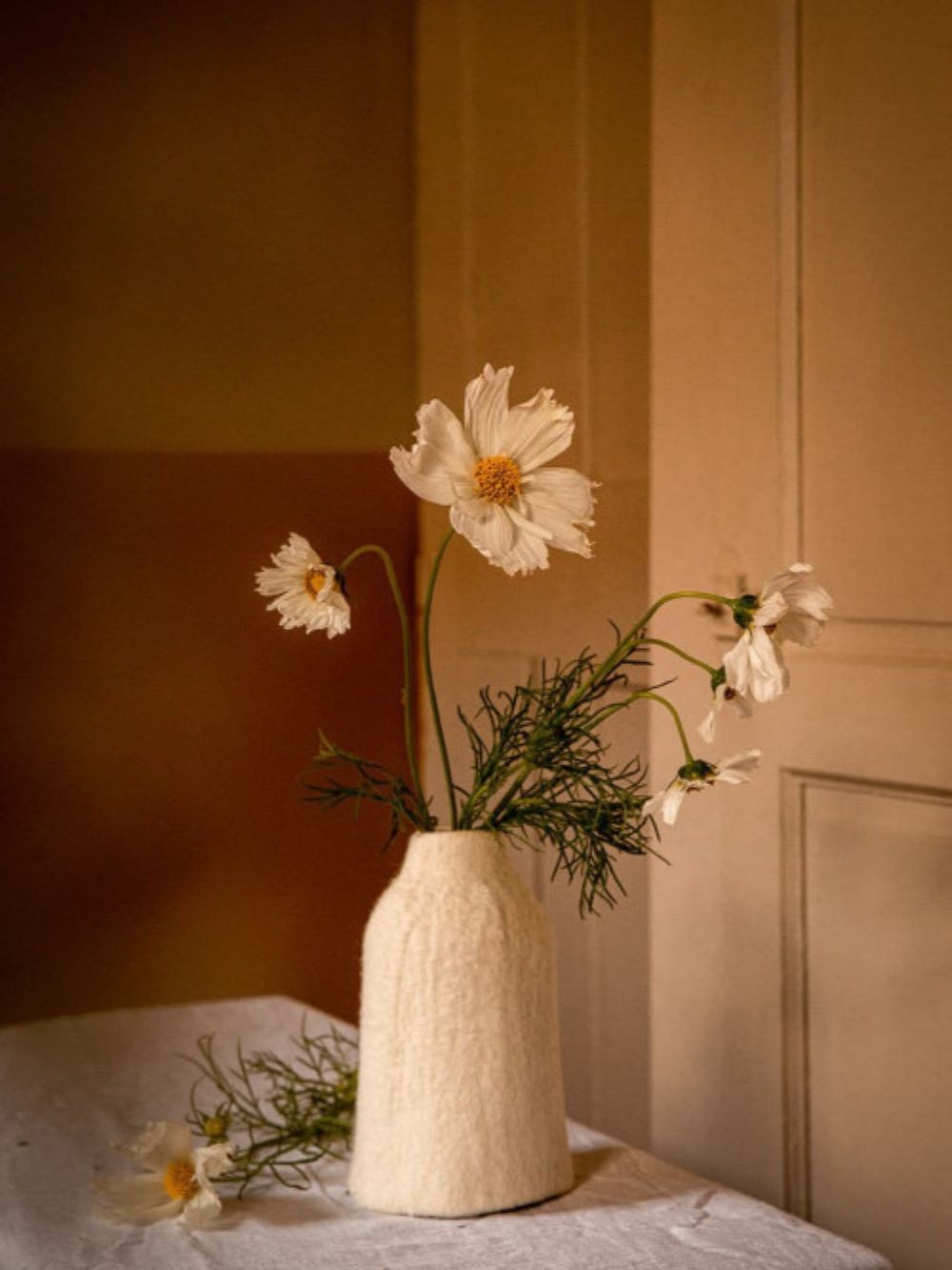 Cache vase cloche permet de dissimuler les contenants que l'on veut cacher, tout en magnifiant les créations florales ! Le mélange du végétal avec le feutre apportera une touche chaleureuse à votre décoration.