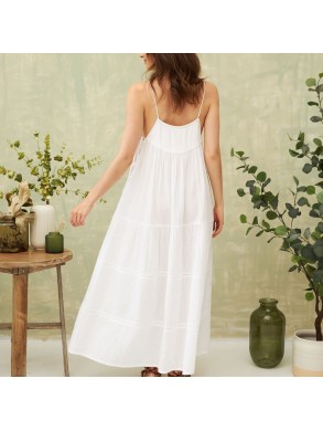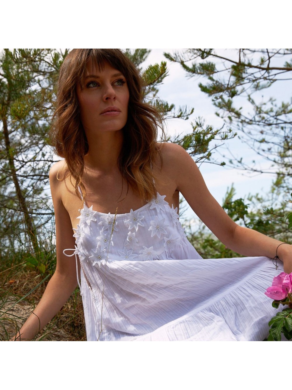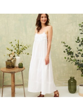 Robe longue bohème blanche à bretelles. Plastron fleuri confectionné à la main. Idéale pour les cérémonies.