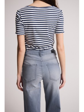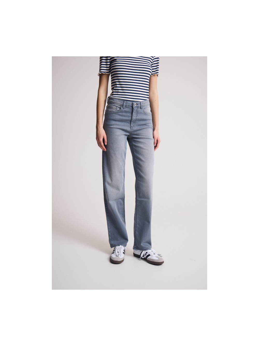 Jean gris clair taille haute confort, longueur cheville jambe droite
