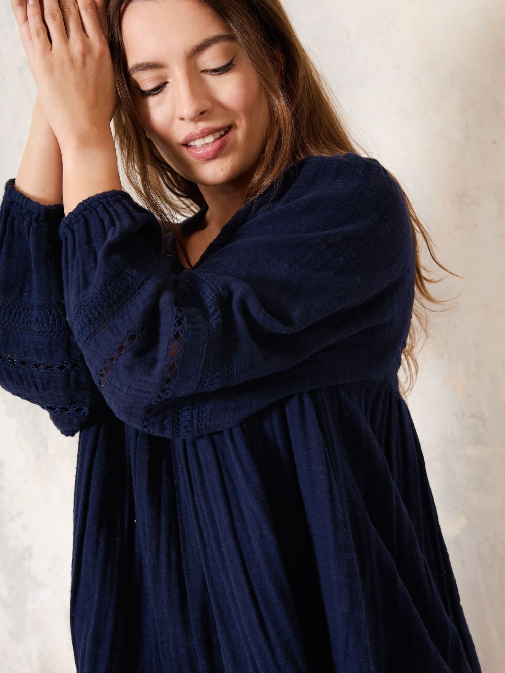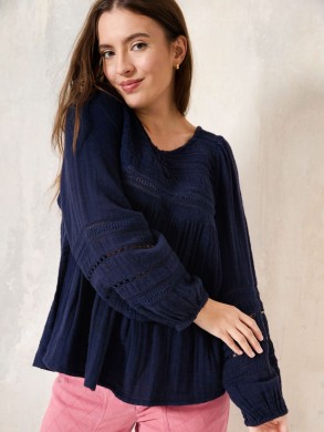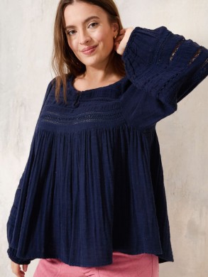Blouse trapèze bleue avec de la dentelle ajourée que sur les manches bouffante