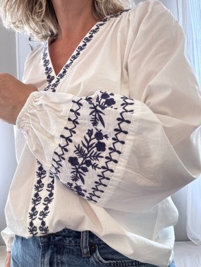 Blouse blanche brodée en bleu