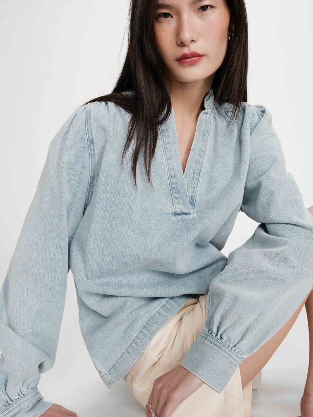 Blouse droite décontracté et raffiné. Les poignets boutonnés agrémentés du monogramme G&M apportent une signature subtile et élégante. L'encolure fendue en V, les fronces aux épaules et les manches bouffantes soulignent la féminité de la silhouette.