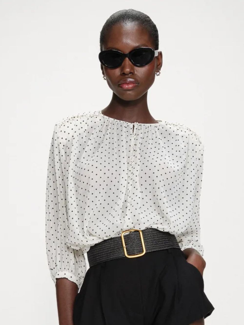 La blouse manche 3/4 est confectionnée dans un tissu fluide et léger sublimé par des pois floqués en velours. Les éléments tels que les détails de biais et volants, agrémentés de fronces aux épaules et les manches bouffantes, dessinent une silhouette féminine et raffinée. Le modèle a une encolure ronde et une ouverture boutonnée.